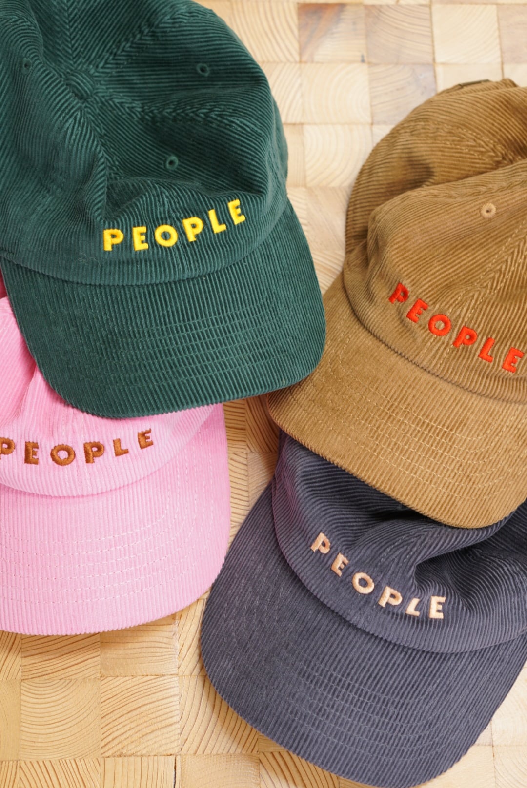 ちょっといなたい雰囲気のコーデュロイに、PEOPLEの口ゴ刺繍です。ガシガシつかって洗濯して色落ちしてもかわいいと思う4カラーで作りました。